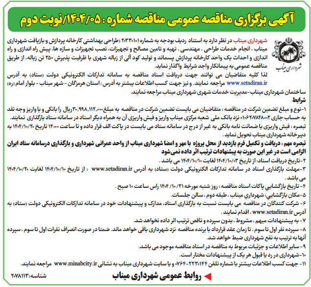 تبصره : فیش واریزی یا ضمانت نامه بانکی به غیر از درج در سامانه ستاد می بایست در پاکت الف قرار داده و تا ساعت 14:00 تاریخ 20/10/1404 به دبیرخانه شهرداری میناب تحویل نماید .