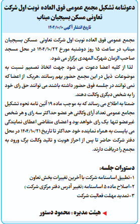 مجمع عمومی فوق العاده نوبت اول شرکت تعاونی مسکن بسیجیان میناب در ساعت 15 روز دوشنبه مورخ 22/10/1404 در محل مسجد صاحب الزمان شهرک المهدی برگزار می شود.
