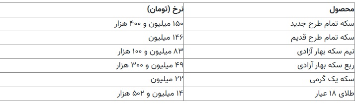 قیمت طلای ۱۸ عیار هر گرم ۱۴ میلیون و ۵۰۲ هزار تومان و قیمت سکه طرح جدید ۱۵۰ میلیون و ۴۰۰ هزارتومان اعلام شد.