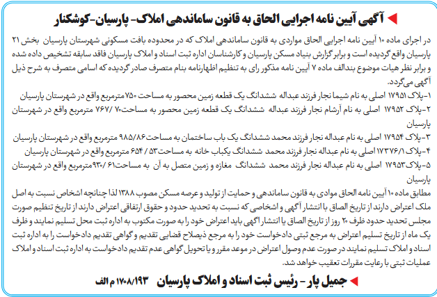 در اجرای ماده ۱۰ آیین نامه اجرایی الحاق مواردی به قانون ساماندهی املاک که در محدوده بافت مسکونی شهرستان پارسیان بخش ۲۱ پارسیان واقع گردیده است و برابر گزارش بنیاد مسکن پارسیان و کارشناسان اداره ثبت اسناد و املاک پارسیان فاقد سابقه تشخیص داده شده و برابر نظر هیات موضوع بندالف ماده ۷ آیین نامه مذکور رای به تنظیم اظهارنامه بنام متصرف صادر گردیده که اسامی متصرف به شرح ذیل آگهی میگردد.