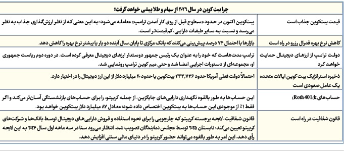 درست است که نمیتوان انکار کرد پس از دو سال بازدهی بیش از ۱۰۰ درصدی، در سال 2025 بیت کوین با حدود ۶ درصد کاهش سرمایهگذاران را ناامید کرد اما برخی تحلیلگران معتقدند به دلیل کاهش نرخ بهره فدرال رزرو آمریکا، حمایت دولت ترامپ از کریپتو و قانون شفافیت ارزهای دیجیتال در سال ۲۰۲۶ شاهد بازگشت قوی بیت کوین و بازار کریپتو خواهیم بود. گفتنی است؛ بیتکوین در ماه نوامبر وارد یک فاز نزولی شد و از اوج خود در حدود ۱۲۶۰۰۰ دلار، ۴۴ درصد کاهش یافت. تحلیلگران، بخش عمدهای از عملکرد ضعیف بیتکوین در سال ۲۰۲۵ را به «حبابهای منفرد» و «عدم تعادل موقت اهرم» در بازار ارزهای دیجیتال نسبت دادهاند و معتقدند این موضوع در سال 2026 ادامهدار نخواهد بود. گفتنی است؛ بسیاری، این قیمتها را فرصتی برای خرید عنوان کردهاند و معتقدند وقتی قیمتها و عوامل بنیادی در جهت مخالف حرکت میکنند؛ فرصت خرید ایجاد میشود. بر همین اساس، پیشبینی میشود؛ بیتکوین در سال ۲۰۲۶ از شاخصهای سهام و طلا پیشی بگیرد.