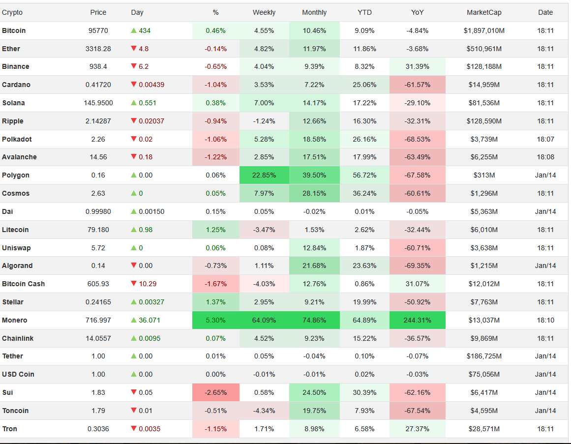 بیت کوین و اتریوم در معاملات عصرگاهی روز چهارشنبه ۲۴ دی ۱۴۰۴ به ترتیب در قیمت ۹۵۹۴۲ و ۳۳۲۲ دلار داد و ستد شدند.