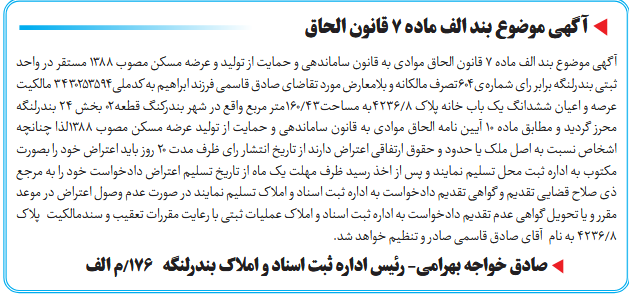 آگهی موضوع بند الف ماده ۷ قانون الحاق موادی به قانون ساماندهی و حمایت از تولید و عرضه مسکن مصوب ۱۳۸۸ مستقر در واحد ثبتی بندرلنگه برابر رای شمارهی604تصرف مالکانه و بلامعارض مورد تقاضای صادق قاسمی فرزند ابراهیم به کدملی3430253594 مالکیت عرصه و اعیان ششدانگ یک باب خانه پلاک 8/4236به مساحت43/160متر مربع واقع در شهر بندرکنگ قطعه02 بخش ۲۴ بندرلنگه محرز گردید و مطابق ماده ۱۰ آیین نامه الحاق موادی به قانون ساماندهی و حمایت از تولید عرضه مسکن مصوب ۱۳۸۸لذا چنانچه اشخاص نسبت به اصل ملک یا حدود و حقوق ارتفاقی اعتراض دارند از تاریخ انتشار رای ظرف مدت ۲۰ روز باید اعتراض خود را بصورت مکتوب به اداره ثبت محل تسلیم نمایند و پس از اخذ رسید ظرف مهلت یک ماه از تاریخ تسلیم اعتراض دادخواست خود را به مرجع ذی صلاح قضایی تقدیم و گواهی تقدیم دادخواست به اداره ثبت اسناد و املاک تسلیم نمایند در صورت عدم وصول اعتراض در موعد مقرر و یا تحویل گواهی عدم تقدیم دادخواست به اداره ثبت اسناد و املاک عملیات ثبتی با رعایت مقررات تعقیب و سندمالکیت پلاک 8/4236 به نام آقای صادق قاسمی صادر و تنظیم خواهد شد.