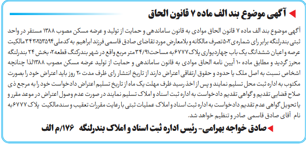 آگهی موضوع بند الف ماده ۷ قانون الحاق موادی به قانون ساماندهی و حمایت از تولید و عرضه مسکن مصوب ۱۳۸۸ مستقر در واحد ثبتی بندرلنگه برابر رای شمارهی502تصرف مالکانه و بلامعارض مورد تقاضای صادق قاسمی فرزند ابراهیم به کدملی3430253594مالکیت عرصه و اعیان ششدانگ یک باب چهاردیواری پلاک6777به مساحت91/34متر مربع واقع در شهر بندرکنگ قطعه02 بخش ۲۴ بندرلنگه محرز گردید و مطابق ماده ۱۰ آیین نامه الحاق موادی به قانون ساماندهی و حمایت از تولید عرضه مسکن مصوب ۱۳۸۸لذا چنانچه اشخاص نسبت به اصل ملک یا حدود و حقوق ارتفاقی اعتراض دارند از تاریخ انتشار رای ظرف مدت ۲۰ روز باید اعتراض خود را بصورت مکتوب به اداره ثبت محل تسلیم نمایند و پس از اخذ رسید ظرف مهلت یک ماه از تاریخ تسلیم اعتراض دادخواست خود را به مرجع ذی صلاح قضایی تقدیم و گواهی تقدیم دادخواست به اداره ثبت اسناد و املاک تسلیم نمایند در صورت عدم وصول اعتراض در موعد مقرر و یا تحویل گواهی عدم تقدیم دادخواست به اداره ثبت اسناد و املاک عملیات ثبتی با رعایت مقررات تعقیب و سندمالکیت پلاک 6777به نام آقای صادق قاسمی صادر و تنظیم خواهد شد.