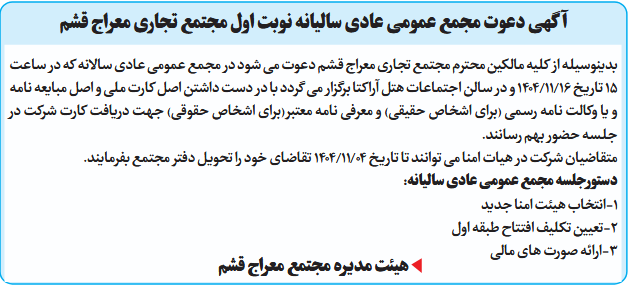 بدینوسیله از کلیه مالکین محترم مجتمع تجاری معراج قشم دعوت می شود در مجمع عمومی عادی سالانه که در ساعت 15 تاریخ 16/11/1404 و در سالن اجتماعات هتل آراکتا برگزار می گردد با در دست داشتن اصل کارت ملی و اصل مبایعه نامه و یا وکالت نامه رسمی (برای اشخاص حقیقی) و معرفی نامه معتبر(برای اشخاص حقوقی) جهت دریافت کارت شرکت در جلسه حضور بهم رسانند.