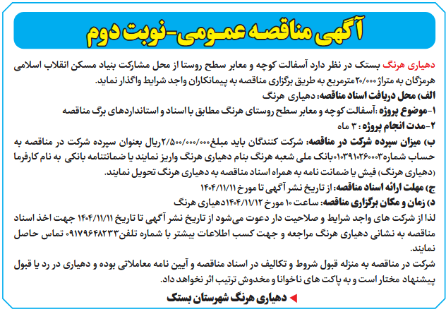 د) زمان و مکان برگزاری مناقصه: ساعت 10 مورخ 12/11/1404دهیاری هرنگ