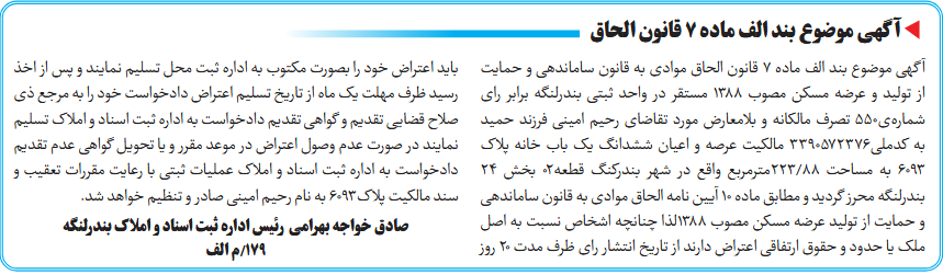 به کدملی3390572376 مالکیت عرصه و اعیان ششدانگ یک باب خانه پلاک 6093 به مساحت 88/223مترمربع واقع در شهر بندرکنگ قطعه02 بخش ۲۴ بندرلنگه محرز گردید و مطابق ماده ۱۰ آیین نامه الحاق موادی به قانون ساماندهی و حمایت از تولید عرضه مسکن مصوب ۱۳۸۸لذا چنانچه اشخاص نسبت به اصل ملک یا حدود و حقوق ارتفاقی اعتراض دارند از تاریخ انتشار رای ظرف مدت ۲۰ روز باید اعتراض خود را بصورت مکتوب به اداره ثبت محل تسلیم نمایند و پس از اخذ رسید ظرف مهلت یک ماه از تاریخ تسلیم اعتراض دادخواست خود را به مرجع ذی صلاح قضایی تقدیم و گواهی تقدیم دادخواست به اداره ثبت اسناد و املاک تسلیم نمایند در صورت عدم وصول اعتراض در موعد مقرر و یا تحویل گواهی عدم تقدیم دادخواست به اداره ثبت اسناد و املاک عملیات ثبتی با رعایت مقررات تعقیب و سند مالکیت پلاک6093 به نام رحیم امینی صادر و تنظیم خواهد شد.
