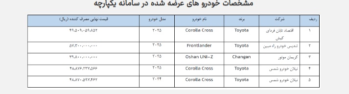 مشخصات خودرو های عرضه شده در سامانه یکپارچه