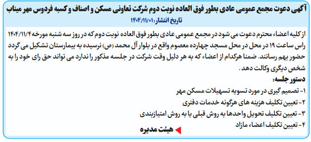از کلیه اعضاء محترم دعوت می شود در مجمع عمومی عادی بطور فوق العاده نوبت دوم که در روز سه شنبه مورخه4/11/1404 راس ساعت 19 در محل در محل مسجد چهارده معصوم واقع در بلوار آل محمد (ص) نرسیده به بیمارستان تشکیل می گردد حضور بهم رسانند. ضمنا هرکدام از اعضاء که به هر دلیل وقت شرکت در جلسه مذکور را ندارد می تواند حق رای خود را به شخص دیگری وکالت دهد .