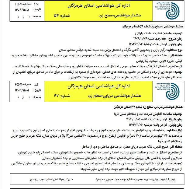 همچنین از صبح شنبه ۴ بهمن تا بعدازظهر دوشنبه ۶ بهمن، فعالیت سامانه بارشی در برخی نقاط استان باعث رگبار باران، رعدوبرق و وزش تندبادهای لحظهای خواهد شد. شهرستانهای بندرعباس، بستک، خمیر، سیریک، بندرلنگه، پارسیان، حاجیآباد، رودان، بشاگرد، قشم، کیش، ابوموسی، جاسک، میناب و جزایر لاوان و سیری در معرض این سامانه قرار دارند.