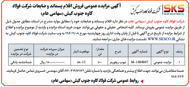 شركت فولاد کاوه جنوب کیش (سهامی عام) در نظر دارد اقلام پسماند و ضایعات خود را (مطابق موارد مندرج در اسناد) مطابق جدول ذیل از طريق مزايده عمومى بفروش برساند. کلیه اشخاص حقیقی و حقوقی میتوانند جهت خرید اسناد مزایده و بازدید از موضوع مزایده و اطلاع از شرایط مزایده از تاریخ درج آگهی تا قبل از پایان وقت اداری روز چهارشنبه مورخ 08/11/1404 به وب سایت شرکت فولاد کاوه جنوب کیش به نشانی WWW.SKSCO.IR (قسمت مزایده های جاری) مراجعه نمایند.