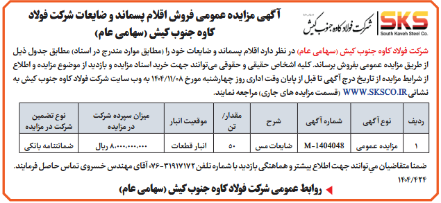 شركت فولاد کاوه جنوب کیش (سهامی عام) در نظر دارد اقلام پسماند و ضایعات خود را (مطابق موارد مندرج در اسناد) مطابق جدول ذیل از طريق مزايده عمومى بفروش برساند. کلیه اشخاص حقیقی و حقوقی میتوانند جهت خرید اسناد مزایده و بازدید از موضوع مزایده و اطلاع از شرایط مزایده از تاریخ درج آگهی تا قبل از پایان وقت اداری روز چهارشنبه مورخ 08/11/1404 به وب سایت شرکت فولاد کاوه جنوب کیش به نشانی WWW.SKSCO.IR (قسمت مزایده های جاری) مراجعه نمایند.