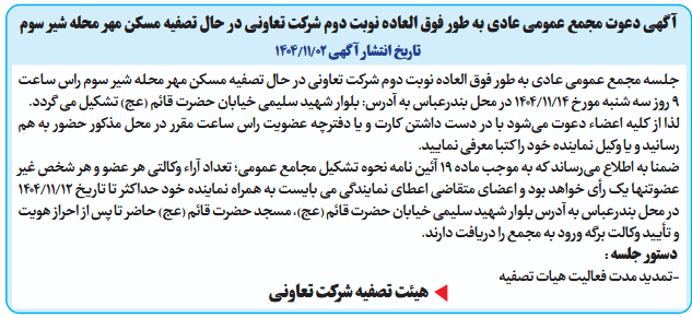 جلسه مجمع عمومی عادی به طور فوق العاده نوبت دوم شرکت تعاونی در حال تصفیه مسکن مهر محله شیر سوم راس ساعت 9 روز سه شنبه مورخ 14/11/1404 در محل بندرعباس به آدرس: بلوار شهید سلیمی خیابان حضرت قائم (عج) تشکیل می گردد.