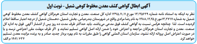 نظر به اینکه به استناد نامه شماره 35629/13 مورخ 1395.11.11 اداره کل صنعت، معدن و تجارت استان هرمزگان گواهی کشف معدن مخلوط کوهی شمیل به شماره 13.27111مورخ 1388.12.25 به نام رضا مرادی واقع در شهرستان بندرعباس، بخش شمیل، دهستان شمیل از درجه اعتبار ساقط اعلام گردیده است. لذا چنانچه هرکس نسبت به گواهی کشف فوق مدعی میباشد، باید حداکثر ظرف مدت ده روز پس از انتشار آگهی فوق به اداره کل