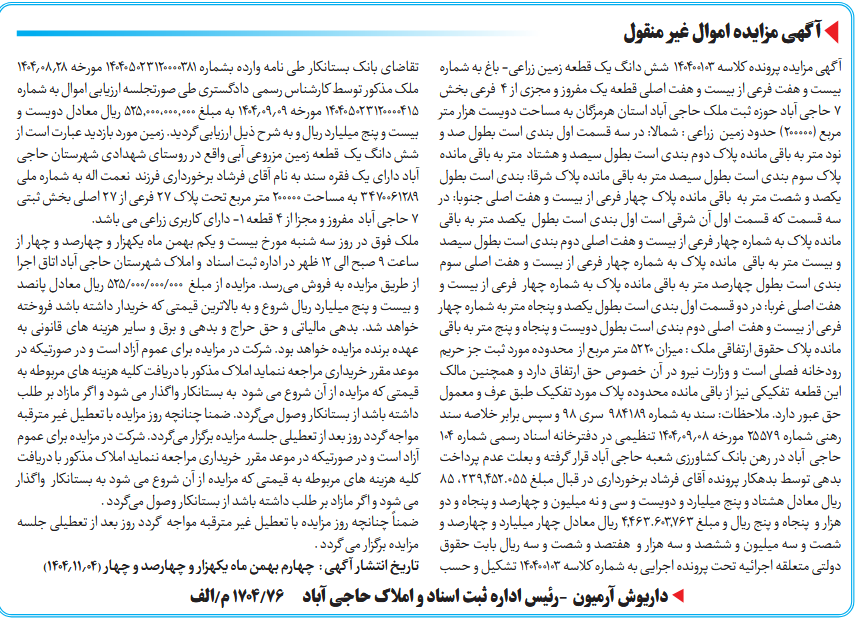 آگهی مزایده پرونده کلاسه ۱۴۰۴۰۰۱۰۳ شش دانگ یک قطعه زمین زراعی- باغ به شماره بیست و هفت فرعی از بیست و هفت اصلی قطعه یک مفروز و مجزی از ۴ فرعی بخش ۷ حاجی آباد حوزه ثبت ملک حاجی آباد استان هرمزگان به مساحت دویست هزار متر مربع (۲۰۰۰۰۰) حدود زمین زراعی : شمالا: در سه قسمت اول بندی است بطول صد و نود متر به باقی مانده پلاک دوم بندی است بطول سیصد و هشتاد متر به باقی مانده پلاک سوم بندی است بطول سیصد متر به باقی مانده پلاک شرقا: بندی است بطول یکصد و شصت متر به باقی مانده پلاک چهار فرعی از بیست و هفت اصلی جنوبا: در سه قسمت که قسمت اول آن شرقی است اول بندی است بطول یکصد متر به باقی مانده پلاک به شماره چهار فرعی از بیست و هفت اصلی دوم بندی است بطول سیصد و بیست متر به باقی مانده پلاک به شماره چهار فرعی از بیست و هفت اصلی سوم بندی است بطول چهارصد متر به باقی مانده پلاک به شماره چهار فرعی از بیست و هفت اصلی غربا: در دو قسمت اول بندی است بطول یکصد و پنجاه متر به شماره چهار فرعی از بیست و هفت اصلی دوم بندی است بطول دویست و پنجاه و پنج متر به باقی مانده پلاک حقوق ارتفاقی ملک : میزان ۵۲۲۰ متر مربع از محدوده مورد ثبت جز حریم رودخانه فصلی است و وزارت نیرو در آن خصوص حق ارتفاق دارد و همچنین مالک این قطعه تفکیکی نیز از باقی مانده محدوده پلاک مورد تفکیک طبق عرف و معمول حق عبور دارد. ملاحظات: سند به شماره ۹۸۴۱۸۹ سری ۹۸ و سپس برابر خلاصه سند رهنی شماره ۲۵۵۷۹ مورخه ۱۴۰۴٫۰۹٫۰۸ تنظیمی در دفترخانه اسناد رسمی شماره ۱۰۴ حاجی آباد در رهن بانک کشاورزی شعبه حاجی آباد قرار گرفته و بعلت عدم پرداخت بدهی توسط بدهکار پرونده آقای فرشاد برخورداری در قبال مبلغ ۲۳۹٬۴۵۲.۰۵۵، ۸۵ ریال معادل هشتاد و پنج میلیارد و دویست و سی و نه میلیون و چهارصد و پنجاه و دو هزار و پنجاه و پنج ریال و مبلغ ۴٬۴۶۳.۶۰۳٬۷۶۳ ریال معادل چهار میلیارد و چهارصد و شصت و سه میلیون و ششصد و سه هزار و هفتصد و شصت و سه ریال بابت حقوق دولتی متعلقه اجرائیه تحت پرونده اجرایی به شماره کلاسه ۱۴۰۴۰۰۱۰۳ تشکیل و حسب تقاضای بانک بستانکار طی نامه وارده بشماره ۱۴۰۴۰۵۰۲۳۱۲۰۰۰۰۳۸۱ مورخه ۱۴۰۴٫۰۸٫۲۸ ملک مذکور توسط کارشناس رسمی دادگستری طی صورتجلسه ارزیابی اموال به شماره ۱۴۰۴۰۵۰۲۳۱۲۰۰۰۰۴۱۵ مورخه ۱۴۰۴٫۰۹٫۰۹ به مبلغ ۵۲۵٬۰۰۰،۰۰۰,۰۰۰ ریال معادل دویست و بیست و پنج میلیارد ریال و به شرح ذیل ارزیابی گردید. زمین مورد بازدید عبارت است از شش دانگ یک قطعه زمین مزروعی آبی واقع در روستای شهدادی شهرستان حاجی آباد دارای یک فقره سند به نام آقای فرشاد برخورداری فرزند نعمت اله به شماره ملی ۳۴۷۰۰۶۱۲۸۹ به مساحت ۲۰۰۰۰۰ متر مربع تحت پلاک ۲۷ فرعی از ۲۷ اصلی بخش ثبتی ۷ حاجی آباد مفروز و مجزا از ۴ قطعه ۱- دارای کاربری زراعی می باشد.