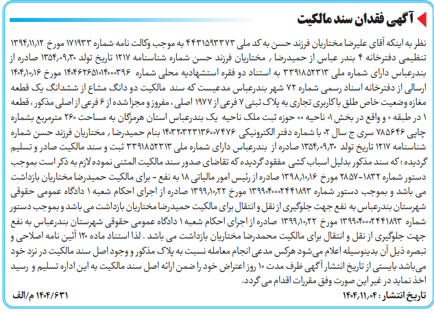 نظر به اینکه آقای علیرضا مختاریان فرزند حسن به کد ملی ۴۴۳۱۵۹۳۳۷۳ به موجب وکالت نامه شماره ۱۷۱۹۳۳ مورخ ۱۳۹۴٫۱۱٫۱۲ تنظیمی دفترخانه ۴ بندر عباس از حمیدرضا ٫ مختاریان فرزند حسن شماره شناسنامه ۱۲۱۷ تاریخ تولد 1354.09.30 صادره از بندرعباس دارای شماره ملی ۳۳۹۱۸۵۲۳۱۳ به استناد دو فقره استشهادیه محلی شماره ۱۴۰۴۶۲۶۵۱۰۱۴۰۰۰۳۹۶ مورخ ۱۴۰۴٫۱۰٫۱۶ ارسالی از دفترخانه اسناد رسمی شماره ۷۲ شهر بندرعباس مدعیست که سند مالکیت دو دانگ مشاع از ششدانگ یک قطعه مغازه وضعیت خاص طلق با کاربری تجاری به پلاک ثبتی ۷ فرعی از ۱۹۷۷ اصلی ، مفروز و مجزا شده از ۶ فرعی از اصلی مذکور ، قطعه ۱ در طبقه 0 و واقع در بخش ۰۱ ناحیه ۰۰ حوزه ثبت ملک ناحیه یک بندرعباس استان هرمزگان به مساحت ۲۶۰ مترمربع بشماره چاپی ۷۸۵۶۴۶ سری ج سال 02 با شماره دفتر الکترونیکی ۱۴۰۳۲۰۳۲۳۱۳۶۰۰۷۴۷۶ بنام حمیدرضا ٫ مختاریان فرزند حسن شماره شناسنامه ۱۲۱۷ تاریخ تولد 1354.09.30 صادره از بندرعباس دارای شماره ملی ۳۳۹۱۸۵۲۳۱۳ ثبت و سند مالکیت صادر و تسلیم گردیده ؛ که سند مذکور بدلیل اسباب کشی مفقود گردیده که تقاضای صدور سند مالکیت المثنی نموده لازم به ذکر است بموجب دستور شماره ۱۸۳۲-۲۸۵۷ مورخ 1398.10.16 صادره از رئیس امور مالیاتی ۱۸ به نفع - برای مالکیت حمیدرضا مختاریان بازداشت می باشد و بموجب دستور شماره ۱۳۹۹۰۴۰۰۰۲۴۴۱۸۹۳ مورخ 1399.10.22 صادره از اجرای احکام شعبه ۱ دادگاه عمومی حقوقی شهرستان بندرعباس به نفع جهت جلوگیری از نقل و انتقال برای مالکیت حمیدرضا مختاریان بازداشت می باشد و بموجب دستور شماره ۱۳۹۹۰۴۰۰۰۲۴۴۱۸۹۳ مورخ 1399.10.22 صادره از اجرای احکام شعبه ۱ دادگاه عمومی حقوقی شهرستان بندرعباس به نفع جهت جلوگیری از نقل و انتقال برای مالکیت محمدرضا مختاریان بازداشت می باشد . لذا استناد ماده ۱۲۰ آئین نامه اصلاحی و تبصره ذیل آن بدینوسیله اعلام میشود هرکس مدعی انجام معامله نسبت به پلاک مذکور و وجود اصل سند مالکیت در نزد خود میباشد بایستی از تاریخ انتشار آگهی ظرف مدت ۱۰ روز اعتراض خود را ضمن ارائه اصل سند مالکیت به این اداره تسلیم و رسید اخذ نماید در غیر این صورت وفق مقررات اقدام می گردد.