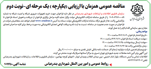 سازمان فناوری اطلاعات و ارتباطات شهرداری بندرعباس در نظر دارد فراخوان جهت خرید تجهیزات ضروری شبکه و امنیت شبکه به شماره 2004004916000089 را از طریق سامانه تدارکات الکترونیکی دولت برگزار نماید.کلیه مراحل برگزاری فراخوان از دریافت و تحویل اسناد فراخوان تا بازگشایی پاکت¬ها از طریق درگاه سامانه تدارکات الکترونیکی دولت (ستاد) به آدرس www.setadiran.ir انجام خواهد شد.متقاضیان شرکت در فراخوان در صورت عدم عضویت در سامانه، نسبت به ثبت نام و دریافت گواهی امضای الکترونیکی (به صورت برخط) برای کلیه صاحبان امضای مجاز و مهر سازمانی اقدام لازم را به عمل آورند.