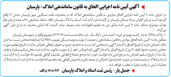 در اجرای ماده ۱۰ آیین نامه اجرایی الحاق مواردی به قانون ساماندهی املاک که در محدوده بافت مسکونی شهر پارسیان بخش ۲۱ واقع گردیده است و برابر گزارش بنیاد مسکن پارسیان و کارشناسان اداره ثبت اسناد و املاک پارسیان فاقد سابقه تشخیص داده شده و برابر نظر هیات موضوع بندالف ماده ۷ آیین نامه مذکور رای به تنظیم اظهارنامه بنام متصرف صادر گردیده که اسامی متصرف به شرح ذیل آگهی میگردد.