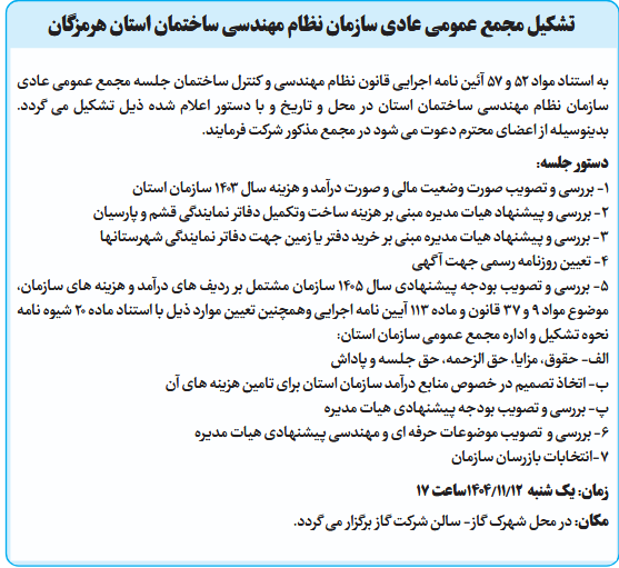 به استناد مواد 52 و 57 آئین نامه اجرایی قانون نظام مهندسی و کنترل ساختمان جلسه مجمع عمومی عادی سازمان نظام مهندسی ساختمان استان در محل و تاریخ و با دستور اعلام شده ذیل تشکیل می گردد. بدینوسیله از اعضای محترم دعوت می شود در مجمع مذکور شرکت فرمایند.