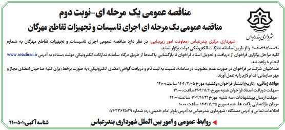شهرداری مرکزی بندرعباس (معاونت امور زیربنایی) در نظر دارد مناقصه عمومی اجرای تاسیسات و تجهیزات تقاطع مهرگان به شماره 2004004916000090 را از طریق سامانه تدارکات الکترونیکی دولت برگزار نماید.