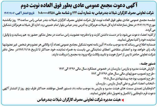 جلسه مجمع عمومی عادی بطور فوق العاده نوبت اول شرکت تعاونی مصرف کارگران شیلات بندر عباس راس ساعت13 روز یکشنبه مورخ 19/11/1404 در محل نمازخانه اداره کل شیلات هرمزگان به آدرس بندر عباس بلوار امام خمینی (ره) اداره کل شیلات هرمزگان تشکیل می گردد.