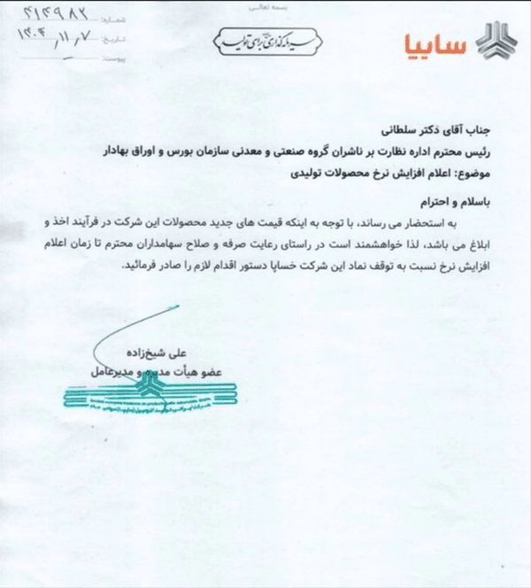 علی شیخزاده عضو هیأتمدیره و مدیرعامل سایپا در نامهای به سلطانی رئیس اداره نظارت بر ناشران گروه صنعتی و معدنی سازمان بورس و اوراق بهادار با موضوع «اعلام افزایش نرخ محصولات تولیدی» اعلام کرد که با توجه به اینکه قیمتهای جدید محصولات این شرکت در فرآیند اخذ و ابلاغ است، لذا در راستای رعایت صرفه و صلاح سهامداران تا زمان اعلام افزایش نرخ نسبت به توقف نماد این شرکت «خساپا» دستور اقدام لازم را صادر فرمایید.