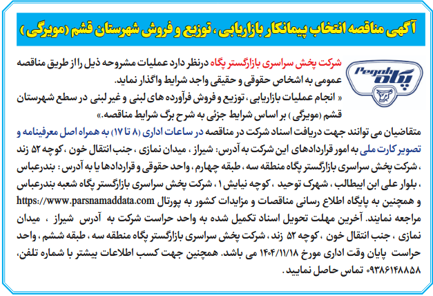 متقاضیان می توانند جهت دریافت اسناد شرکت در مناقصه در ساعات اداری (8 تا 17) به همراه اصل معرفینامه و تصویر کارت ملی به امور قراردادهای این شرکت به آدرس: شیراز ، میدان نمازی ، جنب انتقال خون ، کوچه 52 زند ، شرکت پخش سراسری بازارگستر پگاه منطقه سه ، طبقه چهارم ، واحد حقوقی و قراردادها یا به آدرس : بندرعباس ، بلوار علی ابن ابیطالب ، شهرک توحید ، کوچه نیایش 1 ، شرکت پخش سراسری بازارگستر پگاه شعبه بندرعباس و همچنین به پایگاه اطلاع رسانی مناقصات و مزایدات کشور به پورتال https://www.parsnamaddata.com مراجعه نمایند. آخرین مهلت تحویل اسناد تکمیل شده به واحد حراست شرکت به آدرس شیراز ، میدان نمازی ، جنب انتقال خون ، کوچه 52 زند ، شرکت پخش سراسری بازارگستر پگاه منطقه سه ، طبقه ششم ، واحد حراست پایان وقت اداری مورخ 18/11/1404 می باشد. همچنین جهت کسب اطلاعات بیشتر با شماره تلفن، 09386148858 تماس حاصل نمایید .