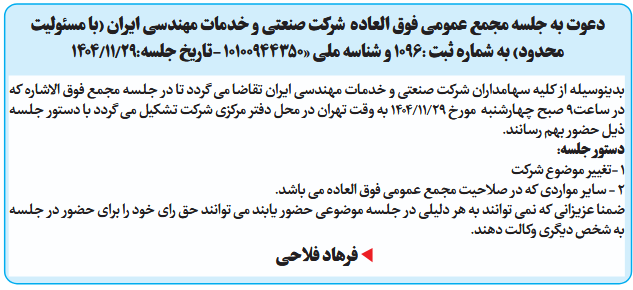 بدینوسیله از کلیه سهامداران شرکت صنعتی و خدمات مهندسی ایران تقاضا می گردد تا در جلسه مجمع فوق الاشاره که در ساعت9 صبح چهارشنبه مورخ 29/11/1404 به وقت تهران در محل دفتر مرکزی شرکت تشکیل می گردد با دستور جلسه ذیل حضور بهم رسانند.