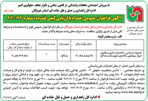 اداره کل راهداری و حمل و نقل جاده ای استان هرمزگان در نظر دارد فراخوان عمومی فوق را با مشخصات و شرایط کلی ذیل از طریق برگزاری مناقصه ، به شرکت های واجد شرایط واگذار نماید.