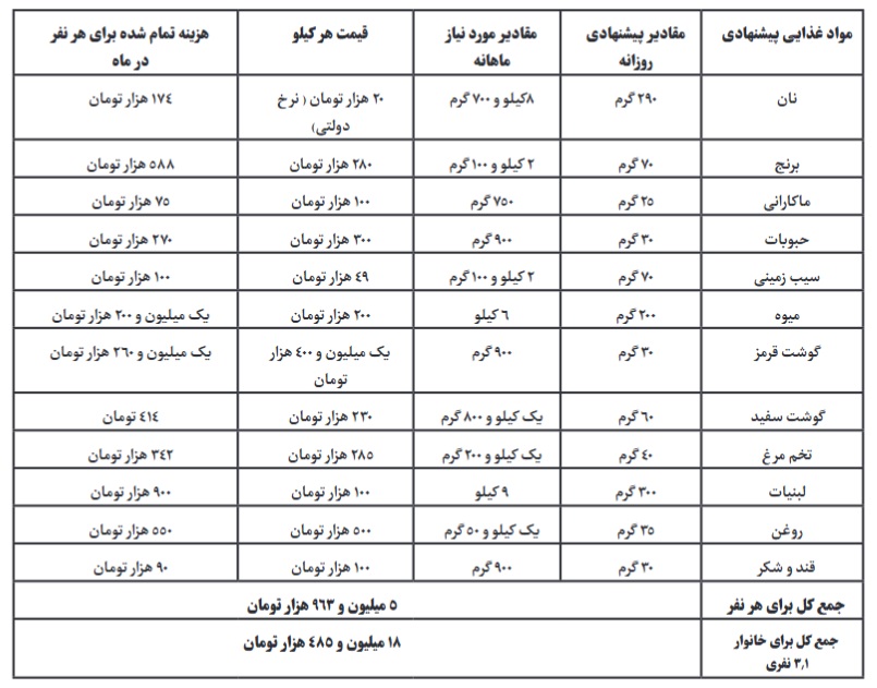 حداقل هزینه خوراک یک خانوار بر اساس سبد غذایی مطلوب ایران چقدر است؟