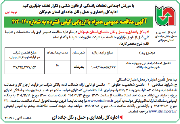 ج) شرایط متقاضی : 1 - داشتن شخصیت حقوقی 2- داشتن توانایی ارائه ضمانت نامه بانکی شرکت در فرآيند ارجاع كار و ضمانت نامه انجام تعهدات 3- دارا بودن رتبه 3 رشته راه و ترابری . لذا متقاضیانی که دارای شرایط مذکور در بند « ج » فوق بوده و آمادگی اجرای پروژه را دارند می توانند جهت اخذ اسناد مناقصه از ساعت 13:30 مورخ 12/11/1404 لغایت ساعت .13:00 مورخ 19/11/1404 به پایگاه اینترنتی سامانه تدارکات الترونیکی دولت به آدرس www.setadiran.ir مراجعه نمایند، آخرین مهلت تحویل اسناد مناقصه، ساعت 13:00