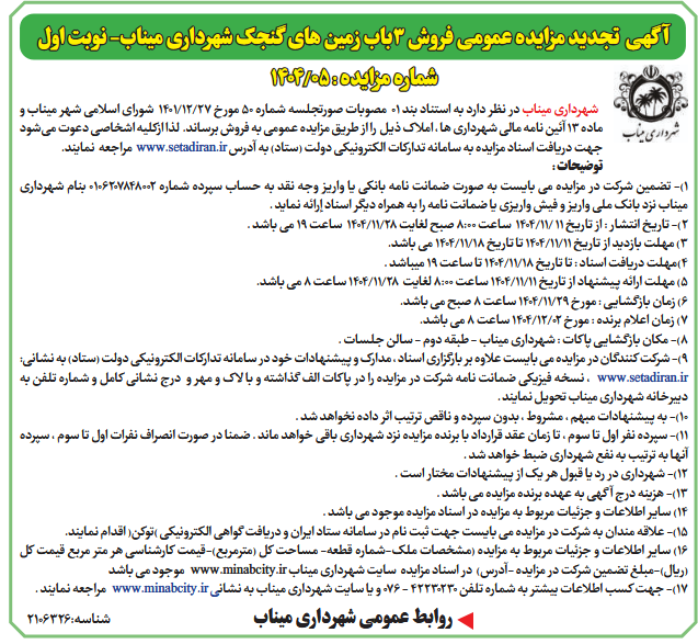 آگهی تجدید مزایده عمومی فروش 3باب زمین های گنجک شهرداری میناب- نوبت اول