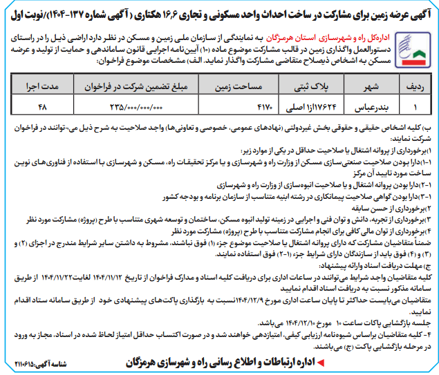 آگهی عرضه زمین برای مشارکت در ساخت احداث واحد مسکونی و تجاری 16.6 هکتاری ( آگهی شماره 137-1404)/نوبت اول
