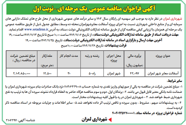 شهرداری لمزان در نظر دارد به موجب قیر سهمیه ای رایگان سال 1403 و سایر درآمد های عمومی شهرداری از محل طرح های تملک دارایی های سرمایه ای و از منابع داخلی شهرداری نسبت به اجرای پروژه آسفالت معابرشهرلمزان(محله ده وسط) مطابق جدول ذیل از طریق مناقصه عمومی یک مرحله ای همزمان با ارزیابی کیفی مناقصه گران از طریق سامانه تدارکات الکترونیکی دولت (ستاد) به آدرس www.setadiran.ir اقدام نماید.