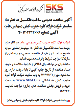 شركت فولاد کاوه جنوب کیش(سهامی عام) در نظر دارد جهت ساخت فلکسیبل به قطر 150 میلیمتر(مطابق موارد مندرج در اسناد) از طريق مناقصه عمومى دو مرحلهای از سازندگان واجد شرایط و توانمند دعوت نماید.