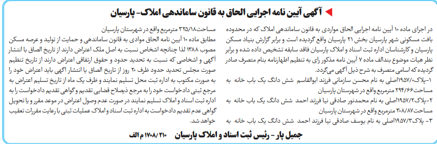 در اجرای ماده ۱۰ آیین نامه اجرایی الحاق مواردی به قانون ساماندهی املاک که در محدوده بافت مسکونی شهر پارسیان بخش ۲۱ پارسیان واقع گردیده است و برابر گزارش بنیاد مسکن پارسیان و کارشناسان اداره ثبت اسناد و املاک پارسیان فاقد سابقه تشخیص داده شده و برابر نظر هیات موضوع بندالف ماده ۷ آیین نامه مذکور رای به تنظیم اظهارنامه بنام متصرف صادر گردیده که اسامی متصرف به شرح ذیل آگهی میگردد.