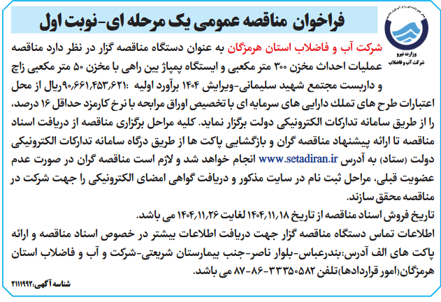 شركت آب و فاضلاب استان هرمزگان به عنوان دستگاه مناقصه گزار در نظر دارد مناقصه عملیات احداث مخزن 300 متر مكعبی و ایستگاه پمپاژ بین راهی با مخزن 50 متر مكعبی زاچ و داربست مجتمع شهید سلیمانی-ویرایش 1404 برآورد اولیه :90.661.453.621ریال از محل اعتبارات طرح های تملك دارایی های سرمایه ای با تخصیص اوراق مرابحه با نرخ كارمزد حداقل 16 درصد، را از طریق سامانه تداركات الكترونیكی دولت برگزار نماید. كلیه مراحل برگزاری مناقصه از دریافت اسناد مناقصه تا ارائه پیشنهاد مناقصه گران و بازگشایی پاكت ها از طریق درگاه سامانه تداركات الكترونیكی دولت (ستاد) به آدرس www.setadiran.ir انجام خواهد شد و لازم است مناقصه گران در صورت عدم عضویت قبلی، مراحل ثبت نام در سایت مذكور و دریافت گواهی امضای الكترونیكی را جهت شركت در مناقصه محقق سازند.