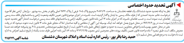 نظر به اینکه تحدید حدود ششدانگ یک قطعه نخلستان به مساحت 19/30871 مترمربع پلاک 1105 فرعی از پلاک 2836 اصلی واقع در بخش سه بوشهر - برازجان اراضی نظر آقا مورد درخواست خانم مدینه احمدی که از طرف مالک رسمی به ایشان واگذار گردیده است. نامبرده در اجرای موضوع قانون تعیین تکلیف وضعیت اراضی و ساختمانهای فاقد سند رسمی تقاضای ثبت نموده است. و حسب تقاضای نامبرده که در اجرای ماده 13 آئین نامه قانون تعیین تکلیف اراضی و ساختمانهای فاقد سند رسمی درخواست انتشار آگهی تحدید حدود نموده است در روز 9/12/1404 در محل شروع بعمل خواهد آمد اینک بوسیله این آگهی از متقاضی و کلیه صاحبان املاک مجاور طبق ماده 14 قانون ثبت دعوت میشود که در وقت مقرر در محل حضور بهمرسانند واخواهی مجاورین نسبت به حدود و حقوق ارتفاقی طبق ماده 20 قانون ثبت از تاریخ تنظیم صورتمجلس تحدیدی تا 30 روز پذیرفته خواهد شد ضمنا معترض مکلف است طبق تبصره 2 ماده واحده قانون تعیین تکلیف پرونده های معترضین ثبتی مصوب 25/2/1373 و ماده 86 آئین نامه اجرایی ظرف مدت یکماه از تاریخ تسلیم اعتراض به اداره ثبت دادخواست به مرجع قضایی محل تسلیم دارد.