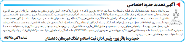 نظر به اینکه تحدید حدود ششدانگ یک قطعه نخلستان به مساحت 1/1740 مترمربع پلاک 1107 فرعی از پلاک 2836 اصلی واقع در بخش سه بوشهر - برازجان اراضی نظر آقا مورد درخواست خانم مدینه احمدی که از طرف مالک رسمی به ایشان واگذار گردیده است. نامبرده در اجرای موضوع قانون تعیین تکلیف وضعیت اراضی و ساختمانهای فاقد سند رسمی تقاضای ثبت نموده است. و حسب تقاضای نامبرده که در اجرای ماده 13 آئین نامه قانون تعیین تکلیف اراضی و ساختمانهای فاقد سند رسمی درخواست انتشار آگهی تحدید حدود نموده است در روز 9/12/1404 در محل شروع بعمل خواهد آمد اینک بوسیله این آگهی از متقاضی و کلیه صاحبان املاک مجاور طبق ماده 14 قانون ثبت دعوت میشود که در وقت مقرر در محل حضور بهمرسانند واخواهی مجاورین نسبت به حدود و حقوق ارتفاقی طبق ماده 20 قانون ثبت از تاریخ تنظیم صورتمجلس تحدیدی تا 30 روز پذیرفته خواهد شد ضمنا معترض مکلف است طبق تبصره 2 ماده واحده قانون تعیین تکلیف پرونده های معترضین ثبتی مصوب 25/2/1373 و ماده 86 آئین نامه اجرایی ظرف مدت یکماه از تاریخ تسلیم اعتراض به اداره ثبت دادخواست به مرجع قضایی محل تسلیم دارد.