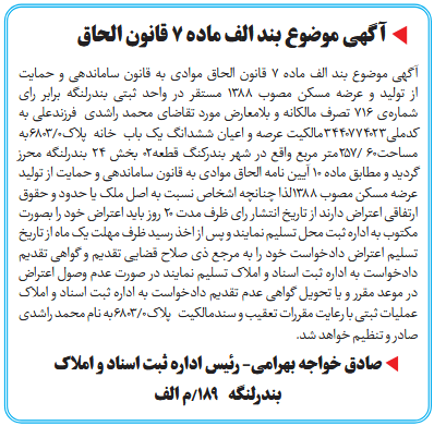 آگهی موضوع بند الف ماده ۷ قانون الحاق موادی به قانون ساماندهی و حمایت از تولید و عرضه مسکن مصوب ۱۳۸۸ مستقر در واحد ثبتی بندرلنگه برابر رای شمارهی 716 تصرف مالکانه و بلامعارض مورد تقاضای محمد راشدی فرزندعلی به کدملی3440774023مالکیت عرصه و اعیان ششدانگ یک باب خانه پلاک0/6803به مساحت60 /257متر مربع واقع در شهر بندرکنگ قطعه02 بخش ۲۴ بندرلنگه محرز گردید و مطابق ماده ۱۰ آیین نامه الحاق موادی به قانون ساماندهی و حمایت از تولید عرضه مسکن مصوب ۱۳۸۸لذا چنانچه اشخاص نسبت به اصل ملک یا حدود و حقوق ارتفاقی اعتراض دارند از تاریخ انتشار رای ظرف مدت ۲۰ روز باید اعتراض خود را بصورت مکتوب به اداره ثبت محل تسلیم نمایند و پس از اخذ رسید ظرف مهلت یک ماه از تاریخ تسلیم اعتراض دادخواست خود را به مرجع ذی صلاح قضایی تقدیم و گواهی تقدیم دادخواست به اداره ثبت اسناد و املاک تسلیم نمایند در صورت عدم وصول اعتراض در موعد مقرر و یا تحویل گواهی عدم تقدیم دادخواست به اداره ثبت اسناد و املاک عملیات ثبتی با رعایت مقررات تعقیب و سندمالکیت پلاک0/6803به نام محمد راشدی صادر و تنظیم خواهد شد.
