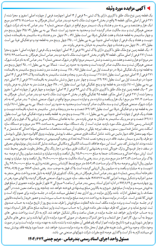 ۲- یک قطعه زمین نوع ملک طلق با کاربری دارای پلاک ثبتی ۴۰۱ فرعی از ۱۴ اصلی (چهارصد و یک فرعی از چهارده اصلی ) مفروز و مجزا شده از ۲۷۱ فرعی از اصلی مذکور ، قطعه ۹۲ واقع در بخش 02حوزه ثبت ملک ناحیه دو بندر عباس استان هرمزگان به مساحت66 /2067 متر مربع (دو هزار و شصت و هفت متر و شصت و شش دسیمتر مربع ) واقع در شهرک صنعتی شماره ۲ بندر عباس که به نام شرکت شهرک صنعتی هرمزگان ثبت و سند مالکیت صادر گردیده است و محدود به حدود زیر است : شمالا: پی به پی بطول (۰۰ ٫ ۴۵ )چهل و پنج متر به قطعه نود و یک تفکیکی شرقا :در دو قسمت اول پی است بطول (۶۵ ٫ ۲۸) بیست و هشت متر و شصت و پنج سانتیمتر به باقیمانده ۲۷۱ فرعی از ۱۴ اصلی دوم پی است بطول (58 /21 ) بیست و یک متر و پنجاه و هشت سانتیمتر به باقیمانده پلاک ۲۶۹ فرعی از ۱۴ اصلی جنوبا :در دو قسمت اول پی است بطول (46 /24) بیست و چهار متر و چهل و شش سانتیمتر به باقیمانده ۲۷۱ فرعی از ۱۴ اصلی دوم پی به پی بطول (00 /11) یازده متر به قطعه نود و پنج تفکیکی غربا :پی است بطول (۰۰ ٫ ۴۸) چهل و هشت متر به خیابان به عرض پانزده متر 3-یک قطعه زمین نوع ملک طلق با کاربری دارای پلاک ثبتی ۴۰۴ فرعی از ۱۴ اصلی( چهارصد و چهار فرعی از چهارده اصلی ) مفروز و مجزا شده از ۲۷۱ فرعی از اصلی مذکور، قطعه ۹۵ تفکیکی واقع در بخش 02حوزه ثبت ملک ناحیه دو بندر عباس استان هرمزگان به مساحت ۱۱۱۶.۱۲ متر مربع ( یک هزار و یکصد و شانزده متر و دوازده دسیمتر مربع) واقع در شهرک صنعتی شماره ۲ بندر عباس که به نام شرکت شهرک صنعتی هرمزگان ثبت و سند مالکیت صادر گردیده است و محدود به حدود زیر است : شمالا: پی به پی بطول (00/11) یازده متر به قطعه نود و دو تفکیکی شرقا :پی است بطول (56 /63) شصت و سه متر و پنجاه و شش سانتیمتر به شماره باقیمانده دویست و هفتاد و یک فرعی از چهارده اصلی جنوبا :پی به پی بطول( ۰۰ ٫ ۲۵) بیست و پنج متر به قطعه یکصد و نوزده تفکیکی غربا: پی است بطول ( 01/62) شصت و دو متر و یک سانتیمتر به خیابان به عرض پانزده متر . بنا به تقاضای بستانکار مبنی بر ارزیابی پلاک فوق و برابر گزارش کارشناس رسمی دادگستری ملک مورد بازدید عبارت است از یک دستگاه سوله صنعتی به مساحت ۱۴۴۰ متر مربع و دو دستگاه سازه اسکلت بتنی شامل فنداسیون، ستون و سقف تیرچه بلوکی در مجاورت آن میباشد مشخصات ساختمانی سوله احداثی که مشتمل بر ۴ سوله بهم متصل فاقد دیوار مابین می باشد شامل اسکلت فلزی صنعتی ،سقف با پوشش یونولیت و ورق گالوانیزه،دیوار بلوکی با پوشش دو طرف پلاستر و سیمان سفید، فاقد درب و پنجره نصب شده( البته تعدادی پنجره آلومینیومی در محوطه سوله موجود بود ولی نصب نشده بودند )با پوشش کف بتنی است این سوله ها فاقد تاسیسات الکتریکی و مکانیکی میباشد بدلیل گذشت زمان یونولیتهای مصرفی در سقف دچار فرسودگی و ترک خوردگی شده و بخشهایی از اسکلت فلزی سوله نیز دچار زنگ زدگی بخاطر رطوبت طبیعی محیط شده است ارزش سوله احداثی و مستحدثات جمعا به مبلغ ۱۱۵٫۶۰۰٫۰۰۰٫۰۰۰ ریال (یکصد و پانزده میلیارد و ششصد میلیون ریال) و عرصه سه پلاک برابر مساحت ۵۰۲۳٫۵۹ متر مربع مندرج در سند رهنی و اسناد مالکیت به مبلغ ۱۹۰٫۹۰۰٫۰۰۰٫۰۰۰ ریال (یکصد و نود میلیارد و نهصد میلیون ریال) ارزیابی و عرصه سه پلاک برابر مساحت ۵۵۰۲٫۸۹ متر مربع توسط کارشناس رسمی نقشه برداری به مبلغ ۲۰۹٫۱۱۰٫۰۰۰٫۰۰۰ ریال (دویست و نه میلیارد و یکصد و ده میلیون ریال )ارزیابی گردیده است پلاک فوق به موجب سند رهنی شماره ۱۷۸۱۰۴ مورخ ۱۳۹۸٫۰۷٫۲۵ دفترخانه اسناد رسمی شماره ۸ شهر بندر عباس استان هرمزگان در رهن بانک کشاورزی قرار گرفته به دلیل عدم پرداخت بدهی منجر به صدور اجرائیه و تشکیل پرونده اجرایی کلاسه ۱۴۰۳۰۱۶۷۷ علیه سقف سازه جرون و شهرک صنعتی هرمزگان گردیده پلاکهای مورد رهن در روز چهارشنبه مورخ ۱۴۰۴٫۱۱٫۲۹ در اداره اجرای اسناد رسمی بندر عباس از ساعت ۹ صبح الی ۱۲ ظهر از طریق مزایده حضوری از مبلغ فوق به فروش میرسد و مزایده از مبلغ فوق شروع و به بالاترین مبلغ پیشنهادی فروخته خواهد 