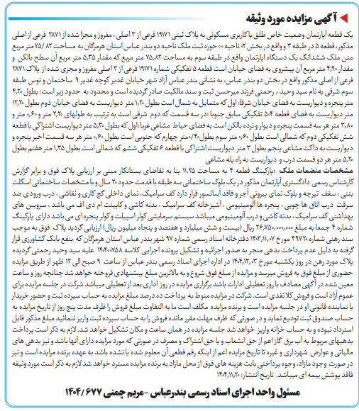 یک قطعه آپارتمان وضعیت خاص طلق با کاربری مسکونی به پلاک ثبتی ۱۹۱۷۱ فرعی از ۳ اصلی ، مفروز و مجزا شده از ۲۸۷۱ فرعی از اصلی مذکور، قطعه ۵ در طبقه ۳ و واقع در بخش ۰۲ ناحیه ۰۰ حوزه ثبت ملک ناحیه دو بندر عباس استان هرمزگان به مساحت 82 /75متر مربع