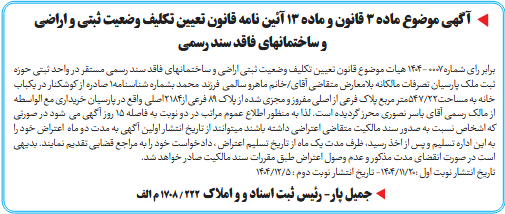 برابر رای شماره0007 -1404 هیات موضوع قانون تعیین تکلیف وضعیت ثبتی اراضی و ساختمانهای فاقد سند رسمی مستقر در واحد ثبتی حوزه ثبت ملک پارسیان تصرفات مالكانه بلامعارض متقاضی آقای/خانم ماهرو سالمی فرزند محمد بشماره شناسنامه1 صادره از کوشکنار در یکباب خانه به مساحت22/547متر مربع پلاک فرعی از اصلی مفروز و مجزی شده از پلاک 89 فرعی از2184اصلی واقع در پارسیان خریداری مع الواسطه از مالک رسمی آقای یاسر نصوری محرز گردیده است. لذا به منظور اطلاع عموم مراتب در دو نوبت به فاصله ۱۵ روز آگهی می شود در صورتی که اشخاص نسبت به صدور سند مالکیت متقاضی اعتراضی داشته باشند میتوانند از تاریخ انتشار اولین آگهی به مدت دو ماه اعتراض خود را به این اداره تسلیم و پس از اخذ رسید، ظرف مدت یک ماه از تاریخ تسلیم اعتراض ، دادخواست خود را به مراجع قضایی تقدیم نمایند. بدیهی است در صورت انقضای مدت مذکور و عدم وصول اعتراض طبق مقررات سند مالکیت صادر خواهد شد.
