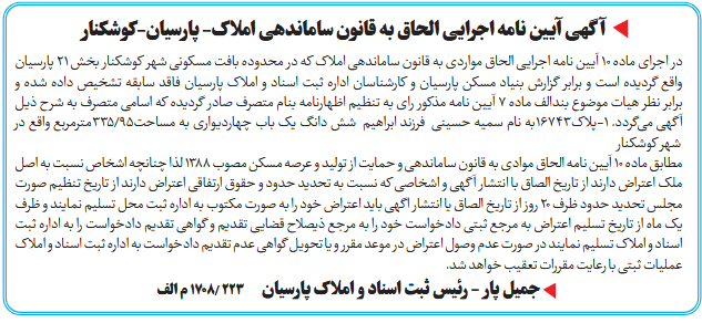 در اجرای ماده ۱۰ آیین نامه اجرایی الحاق مواردی به قانون ساماندهی املاک که در محدوده بافت مسکونی شهر کوشکنار بخش ۲۱ پارسیان واقع گردیده است و برابر گزارش بنیاد مسکن پارسیان و کارشناسان اداره ثبت اسناد و املاک پارسیان فاقد سابقه تشخیص داده شده و برابر نظر هیات موضوع بندالف ماده ۷ آیین نامه مذکور رای به تنظیم اظهارنامه بنام متصرف صادر گردیده که اسامی متصرف به شرح ذیل آگهی میگردد. 1-پلاک16743به نام سمیه حسینی فرزند ابراهیم شش دانگ یک باب چهاردیواری به مساحت95/335مترمربع واقع در