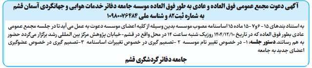 به استناد بندهای 15 - 6و7 -15 ماده 15 اساسنامه مصوب موسسه بدین وسیله از کلیه اعضای موسسه دعوت به عمل می آید تا در جلسه مجمع عمومی عادی بطور فوق العاده که در تاریخ 10/12/1404 روزیک شنبه ساعت 14 در محل واقع در قشم-خیابان پژوهش مرکز بین المللی رشد برگزار میگردد حضور به هم رسانند.دستور جلسه: 1- در خصوص تغییر نام موسسه 2 -تصمیم گیری در خصوص تغییرات اساسنامه 3-تصمیم گیری در خصوص عضوگیری اعضای جدید به جامعه