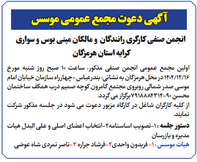 اولین مجمع عمومی انجمن صنفی مذکور، ساعت 10 صبح روز شنبه مورخ 16/12/1404 در محل هرمزگان به نشانی: بندرعباس -چهارراه سازمان خیابان امام موسی صدر شمالی روبروی مجتمع گامرون کوچه صمیم درب همکف ساختمان محسن 90-7918884314برگزار می گردد.