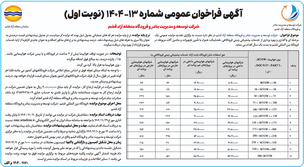 مهلت دریافت اسناد مزایده : متقاضیان شرکت در مزایده می توانند از تاریخ 20 / 11 / 1404 تا پایان وقت اداری مورخ 29/ 11 / 1404 با مراجعه به سامانه ستاد ایران به آدرس الکترونیکی: eauc.setadiran.ir نسبت به دریافت اسناد اقدام نمایند.مهلت و محل تسلیم پیشنهادات مزایده : متقاضیان باید پیشنهادات خود را تا ساعت 14 مورخ 10/12/1404 بارگذاری نمایند و صرفا پاکت (تضمین شرکت در مزایده) را به دفتر مرکزی شرکت توسعه و مدیریت بنادر و فرودگاه قشم واقع در بندر بهمن قشم تحویل دهند.