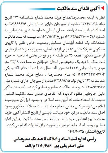 نظر به اینکه محمدرضا/مداح فرزند محمد شماره شناسنامه 192 تاریخ تولد 15/01/1336 صادره از سیرجان دارای شماره ملی 3070969976 به استناد دو فقره استشهادیه محلی ارسالی شماره 50 شهر بندرعباس به شماره 140462655770000576 مورخ 13/11/1404 مدعیست که سند مالکیت ششدانگ یک قطعه آپارتمان مسکونی وضعیت خاص طلق با کاربری مسکونی به پلاک ثبتی 25 فرعی از 671 اصلی، مفروز و مجزا شده از 0 فرعی از اصلی مذکور ، قطعه 25 در طبقه 6 و واقع در بخش ۰۱ ناحیه ۰۰ حوزه ثبت ملک ناحیه یک بندرعباس استان هرمزگان به مساحت 113.18 متر مربع بشماره چاپی 524224 سری الف سال 03 با شماره دفتر الکترونیکی 14032032316012603 که بنام محمدرضا ٫ مداح فرزند محمد شماره شناسنامه 192 تاریخ تولد 15/01/1336صادره از سیرجان دارای شماره ملی 3070969976 ثبت و سند مالکیت صادر و تسلیم گردیده ؛ که سند مذکور دلیل جابجایی مفقود گردیده که تقاضای صدور سند مالکیت المثنى نموده. لذا استناد ماده ۱۲۰ آئین نامه اصلاحی و تبصره ذیل آن بدینوسیله اعلام میشود هر کس مدعی انجام معامله نسبت به پلاک مذکور و وجود اصل سند مالکیت در نزد خود میباشد بایستی از تاریخ انتشار آگهی ظرف مدت ۱۰ روز اعتراض خود را ضمن ارائه اصل سند مالکیت به این اداره تسلیم و رسید اخذ نماید در غیر این صورت وفق مقررات اقدام می گردد.