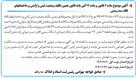 لذا به منظور اطلاع عموم مراتب در دو نوبت به فاصله ۱۵ روز آگهی میشود در صورتی که اشخاص نسبت به صدور سند مالکیت متقاضی اعتراضی داشته باشند می توانند از تاریخ انتشار اولین آگهی به مدت دو ماه اعتراض خود را به این اداره تسلیم و پس از اخذ رسید ظرف مدت یک ماه از تاریخ تسلیم اعتراض دادخواست خود را به مراجع قضایی تقدیم نمایند.