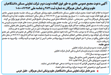 احتراما به اطلاع کلیه اعضاء محترم شرکت تعاونی مسکن دانشگاهیان علوم پزشکی هرمزگان می رساند جلسه مجمع عمومی عادی به طور فوق العاده نوبت دوم ساعت 10:00 صبح روز پنجشنبه مورخ 14/12/1404 در محل سالن اجتماعات معاونت غذا و دارو دانشگاه علوم پزشکی هرمزگان به آدرس : بندرعباس _ خیابان دانشگاه ضلع غربی بیمارستان خلیج فارس ابتدای خیابان نوروز برگزار می گردد.